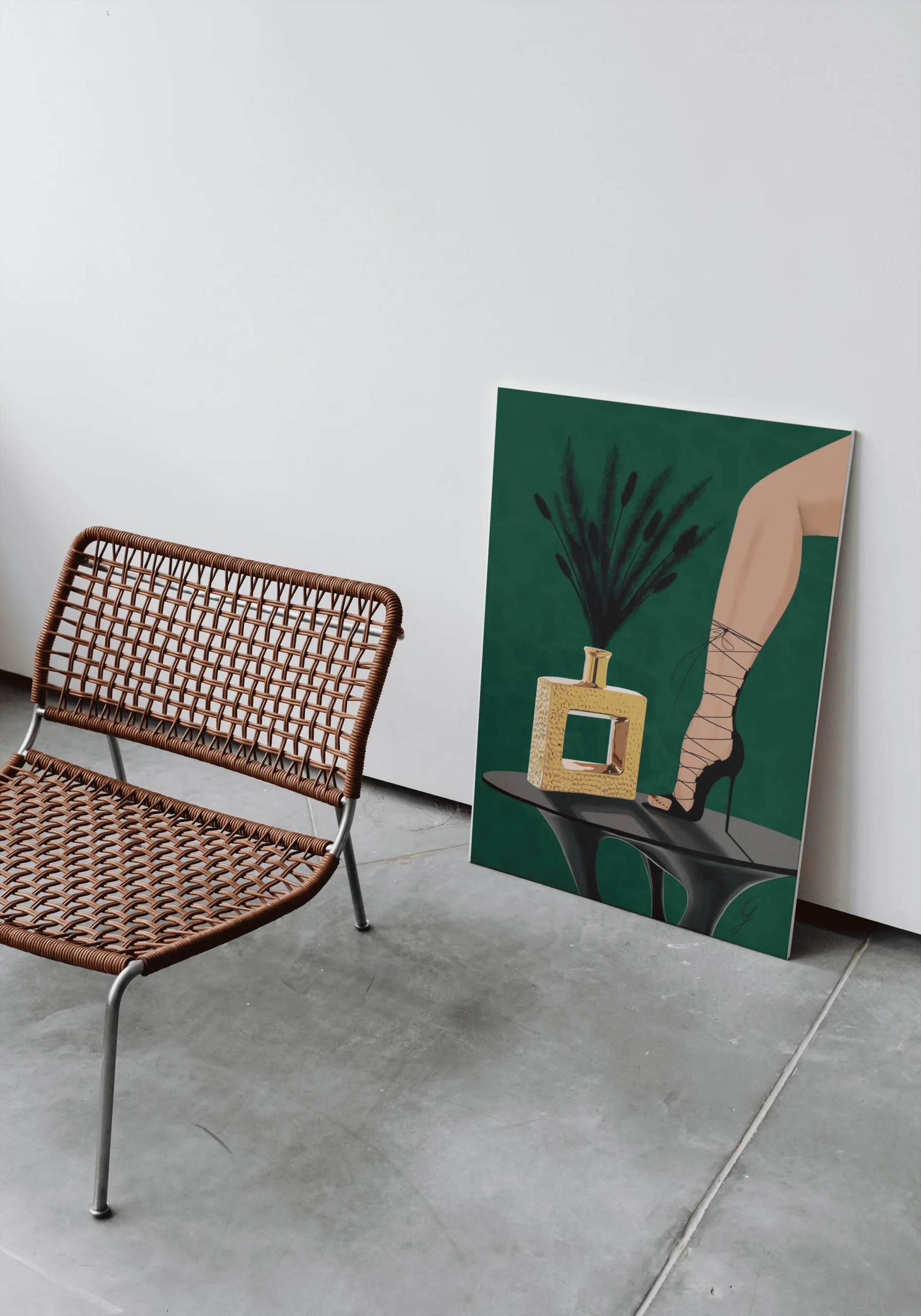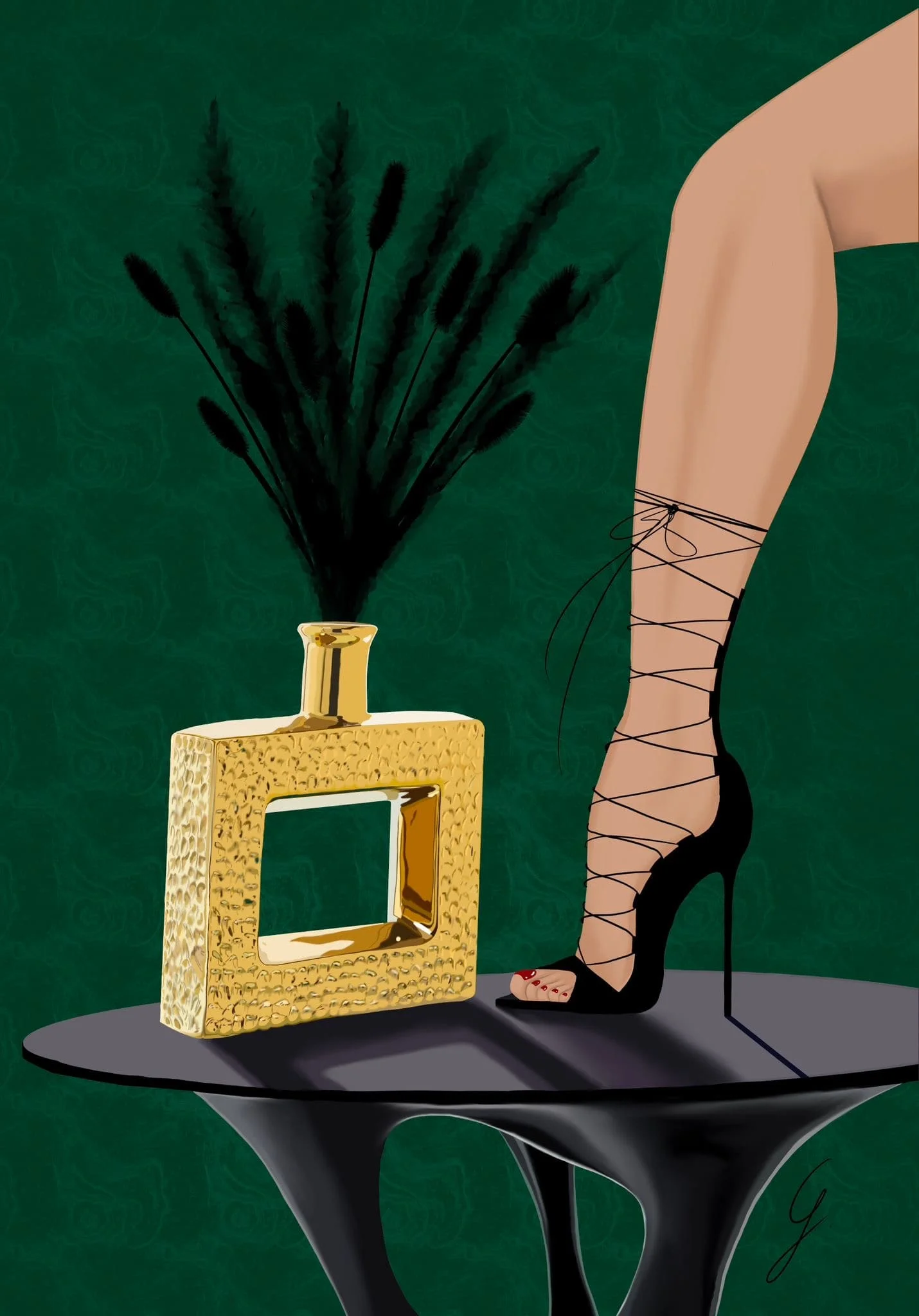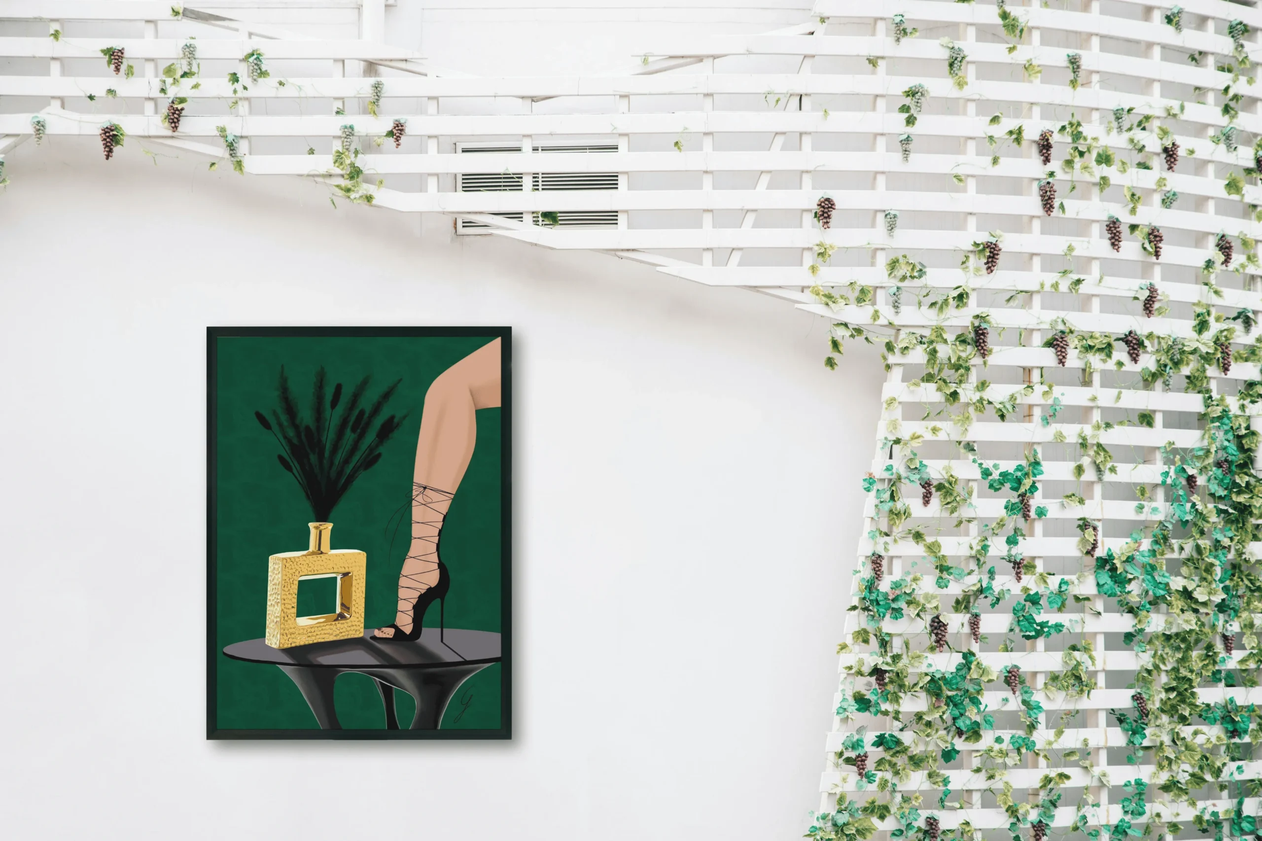 Este cuadro destaca la elegancia de un tacón negro con cordones que subrayan la sensualidad y el estilo, acompañado de un exquisito jarrón dorado con textura martillada que añade un toque de opulencia. El fondo verde profundo evoca un ambiente sofisticado, mientras que la composición celebra la fuerza y la confianza de la feminidad moderna.