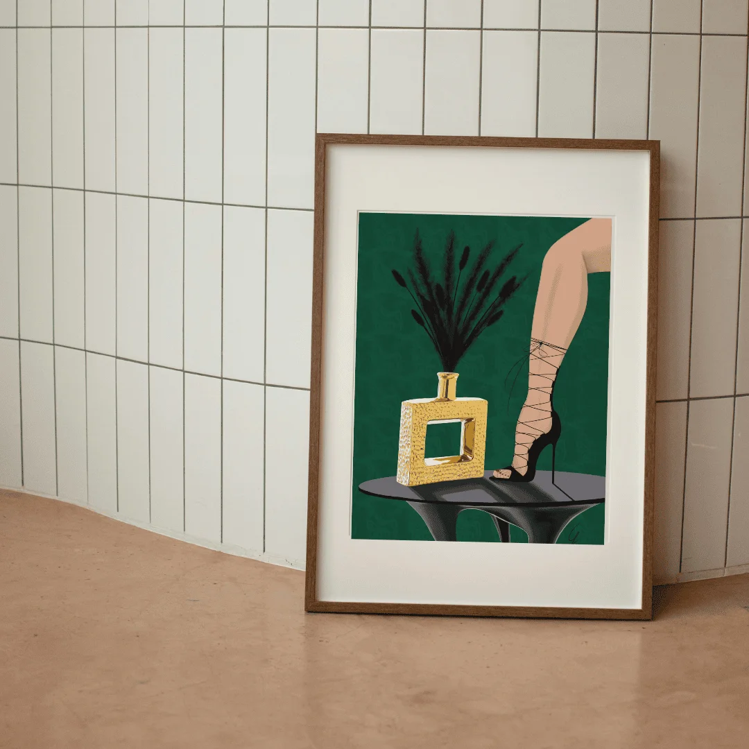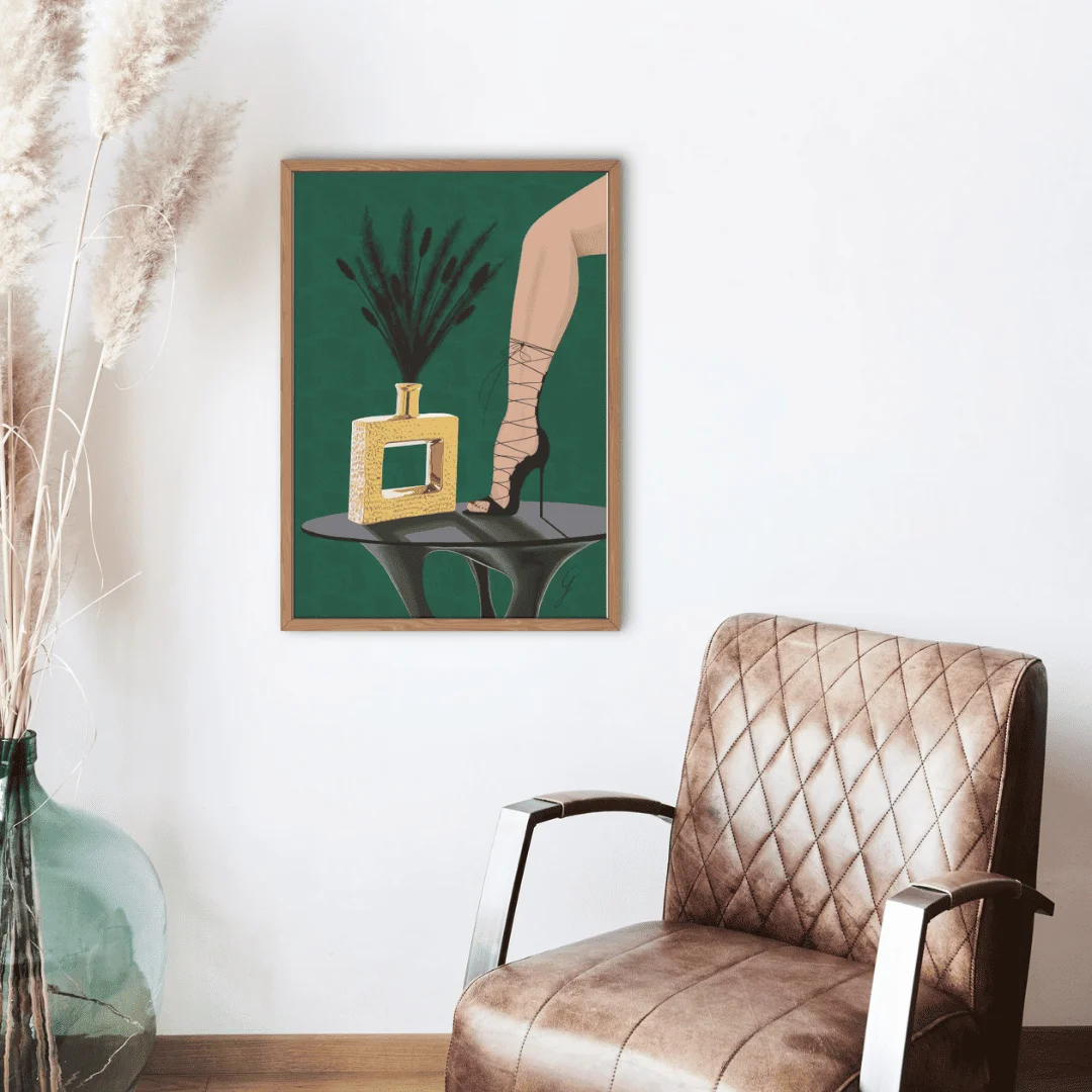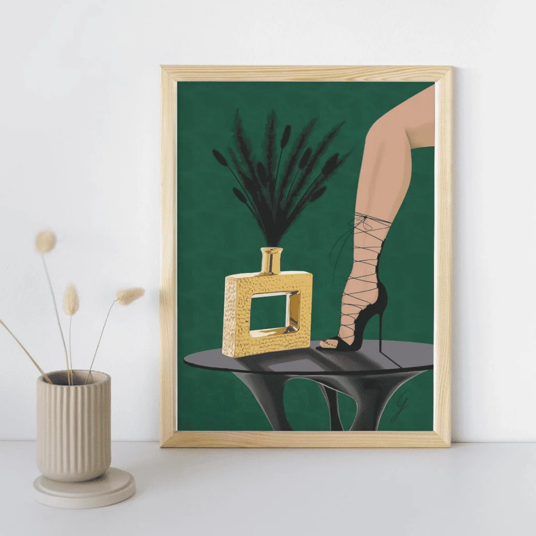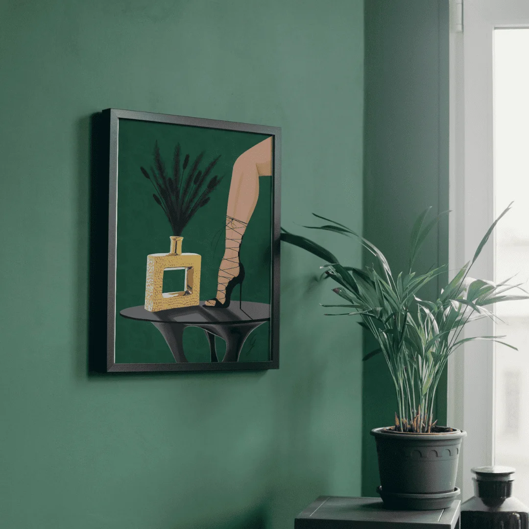 Este cuadro destaca la elegancia de un tacón negro con cordones que subrayan la sensualidad y el estilo, acompañado de un exquisito jarrón dorado con textura martillada que añade un toque de opulencia. El fondo verde profundo evoca un ambiente sofisticado, mientras que la composición celebra la fuerza y la confianza de la feminidad moderna.