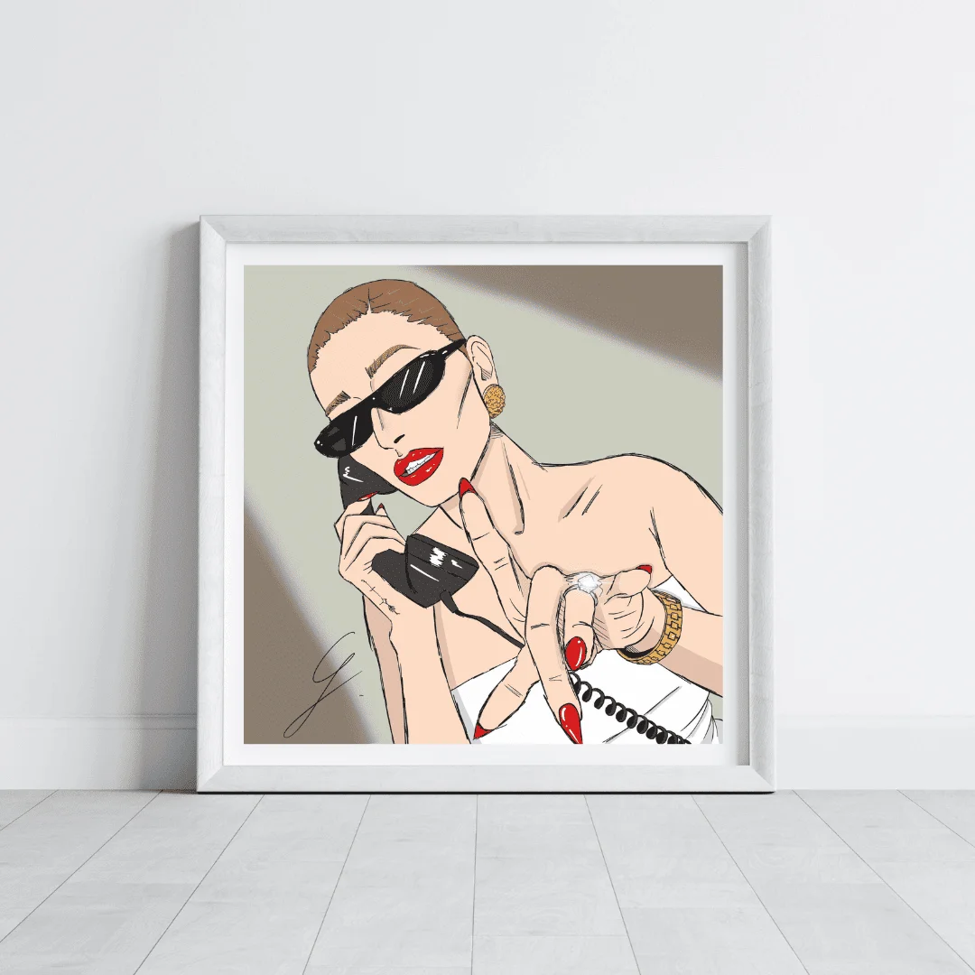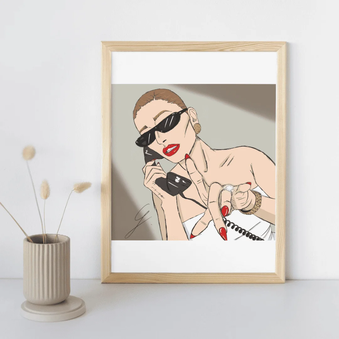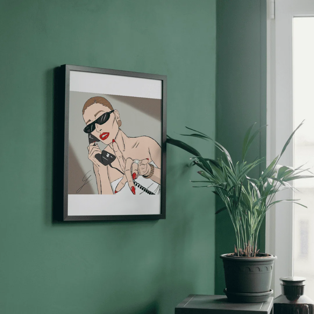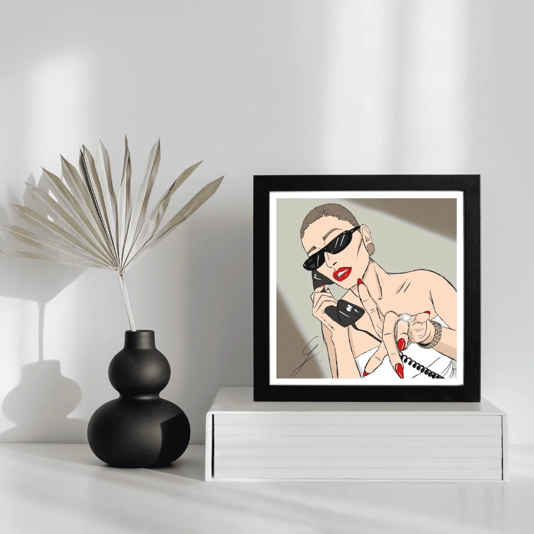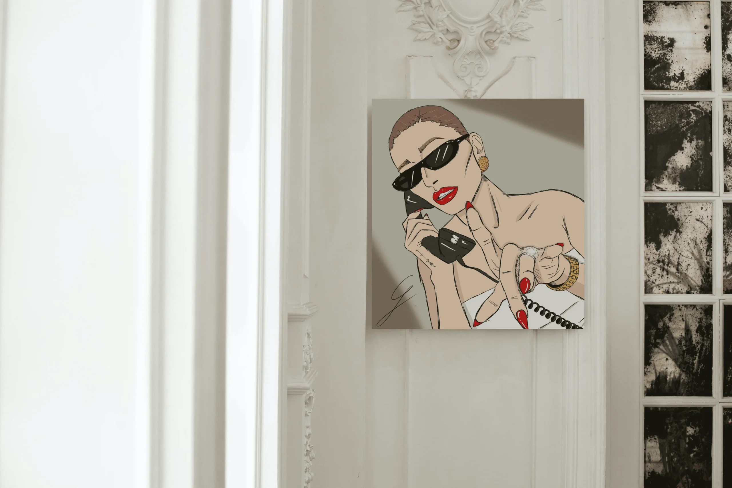 El enfoque en la expresión de sus manos sugiere un instante de pausa en una vida agitada, con un toque contemporáneo y audaz. Esta obra combina a la perfección modernidad y estilo, convirtiéndola en una pieza imprescindible para los amantes del arte que buscan reflejar elegancia y fuerza en sus espacios.